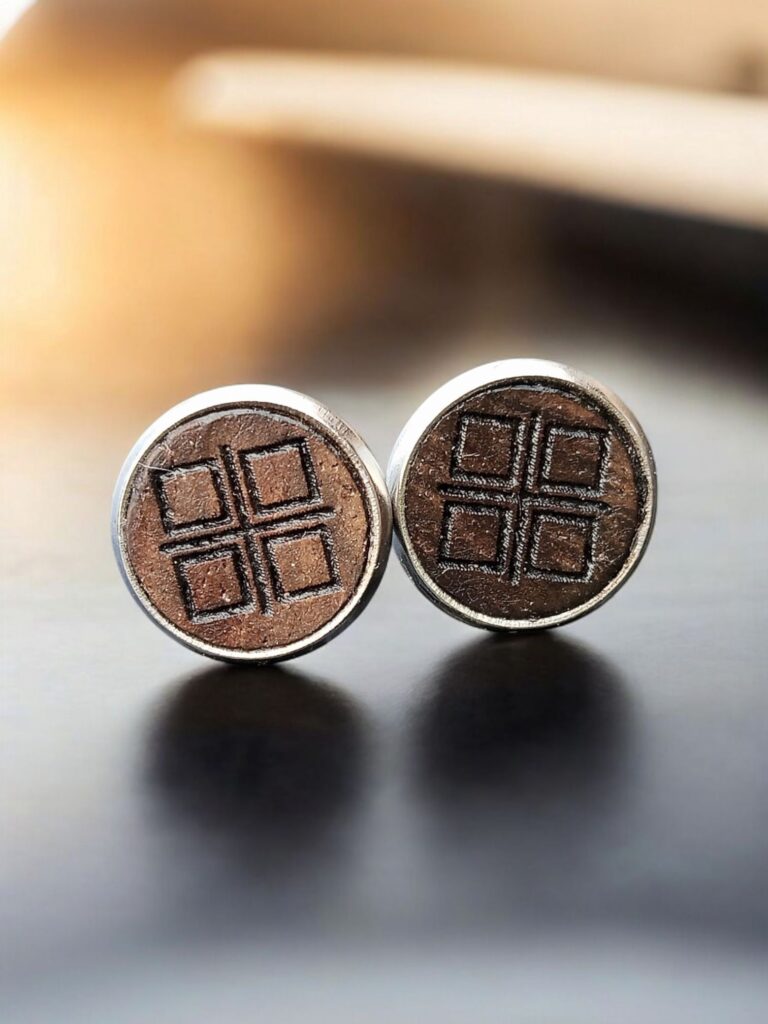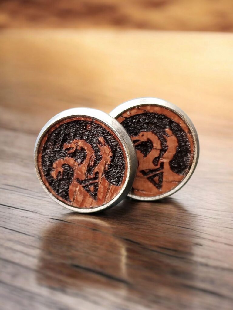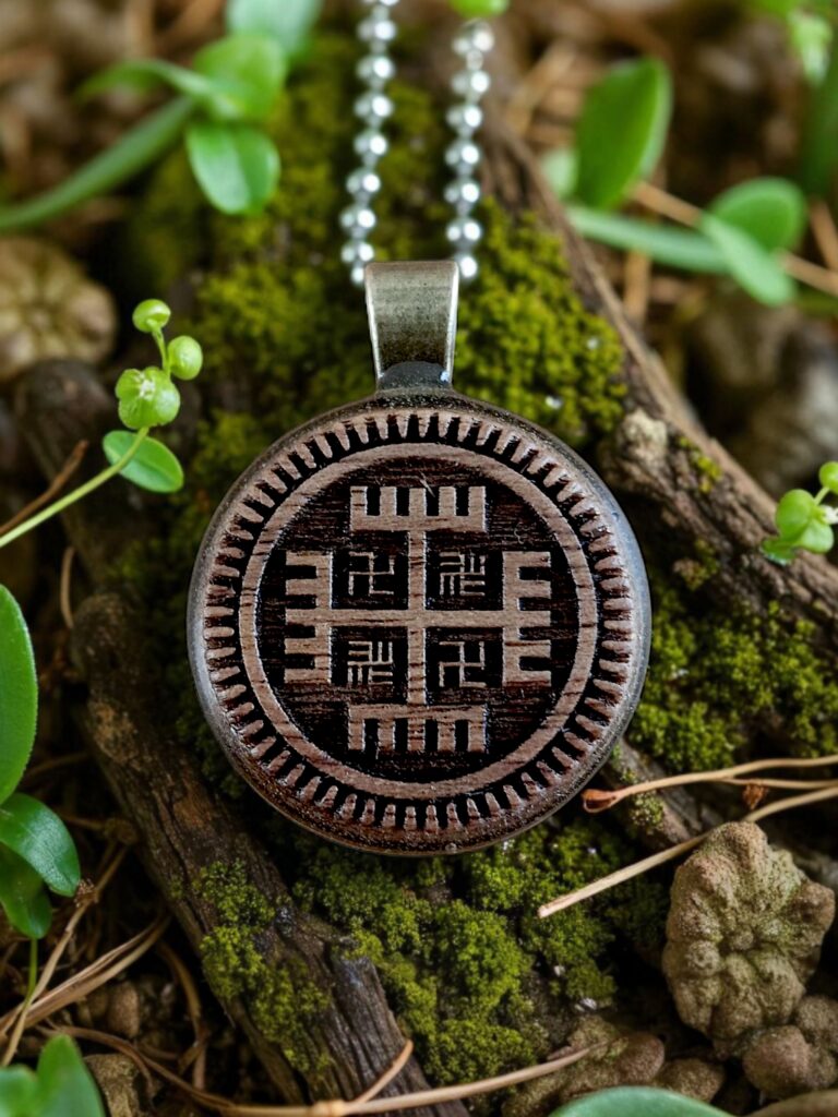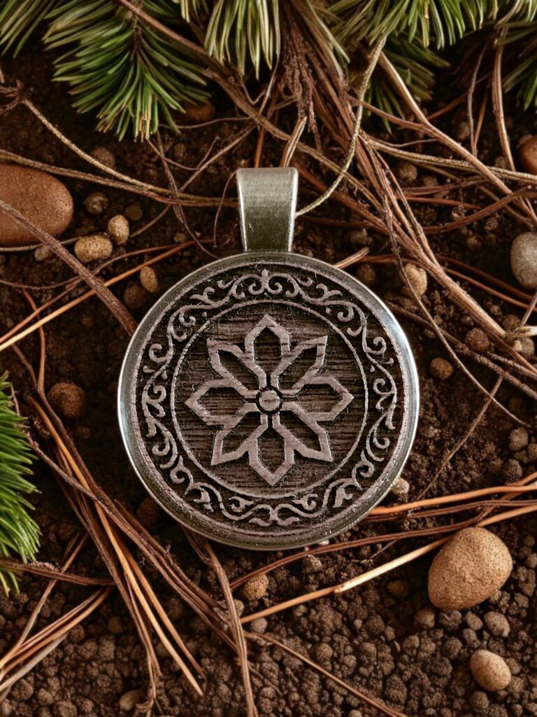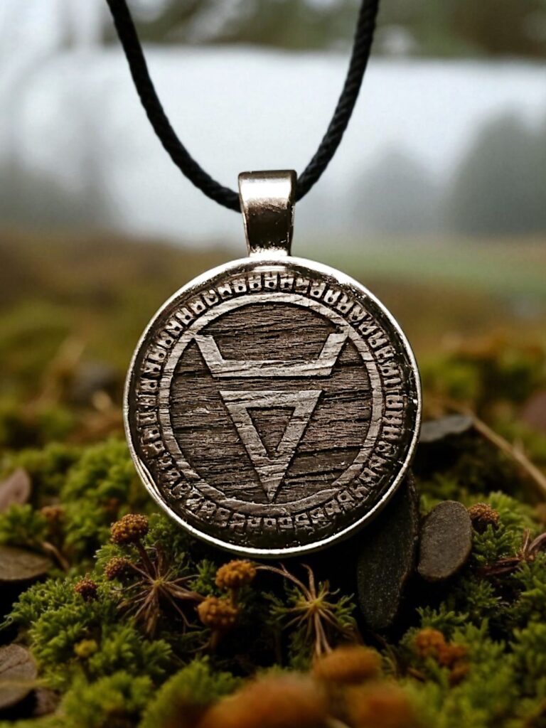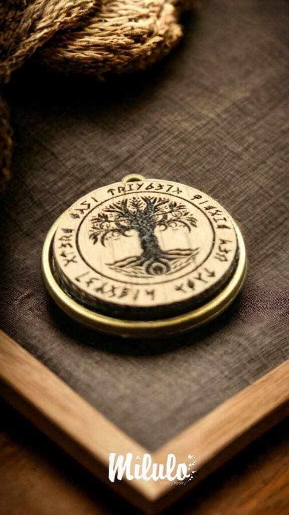 Wisior wykonany na bazie z brązu połączonej z Drewnem Dębu które reprezentuje Wyraj oraz druga strona wykonana z Czarnego Dębu która reprezentuje Nawie.